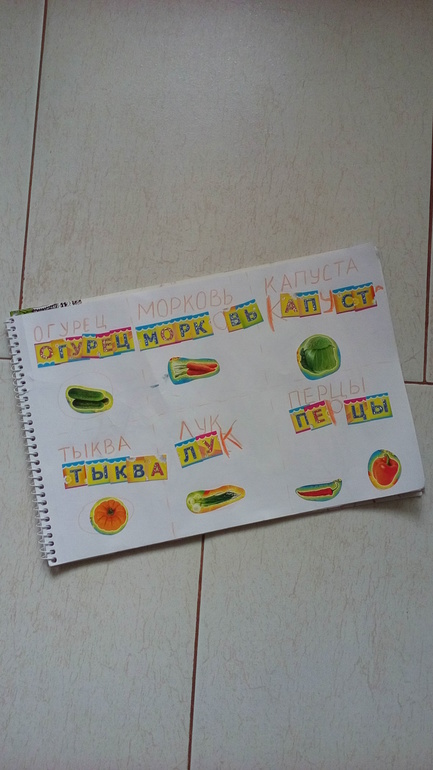 1. Что имеем: наклейки с овощами и наклейки с алфавитом. Задание: наклеить соответствующие буквы под написанными в альбоме (если букв не хватало, то надо было дописать, когда дочка сомневалась в написании буквы, то я ей помогала), после по первой букве догадаться, что за овощ написан и приклеить соответствующую наклейку с овощами.