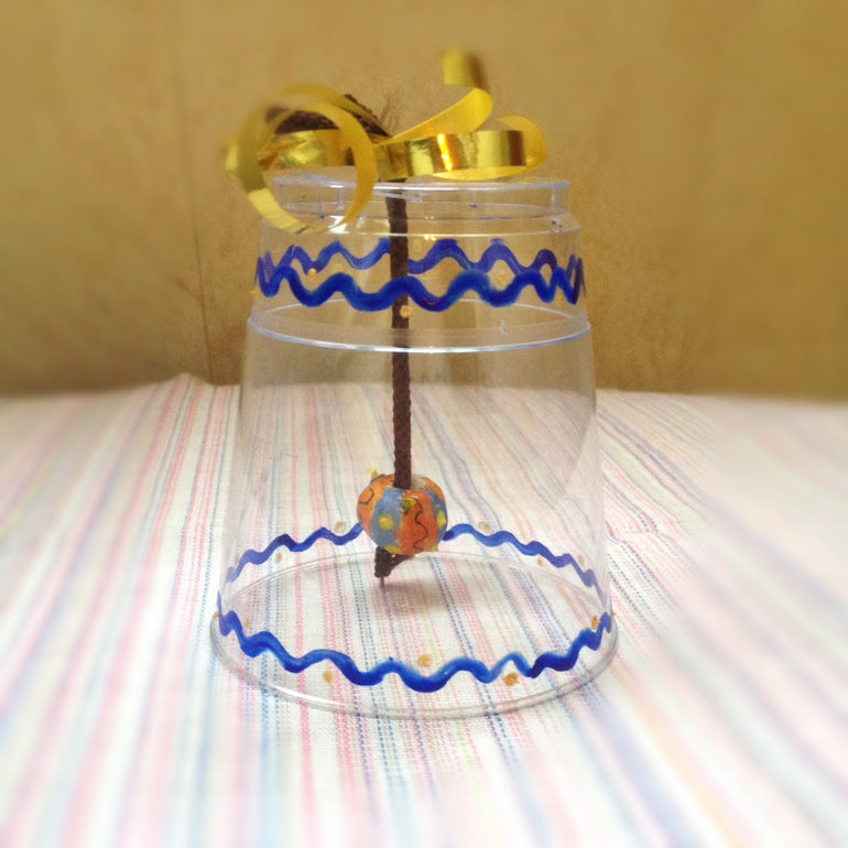 Что еще есть у гномов? Конечно, волшебный колокольчик. Сделали его из пластикового стаканчика и бусинки.