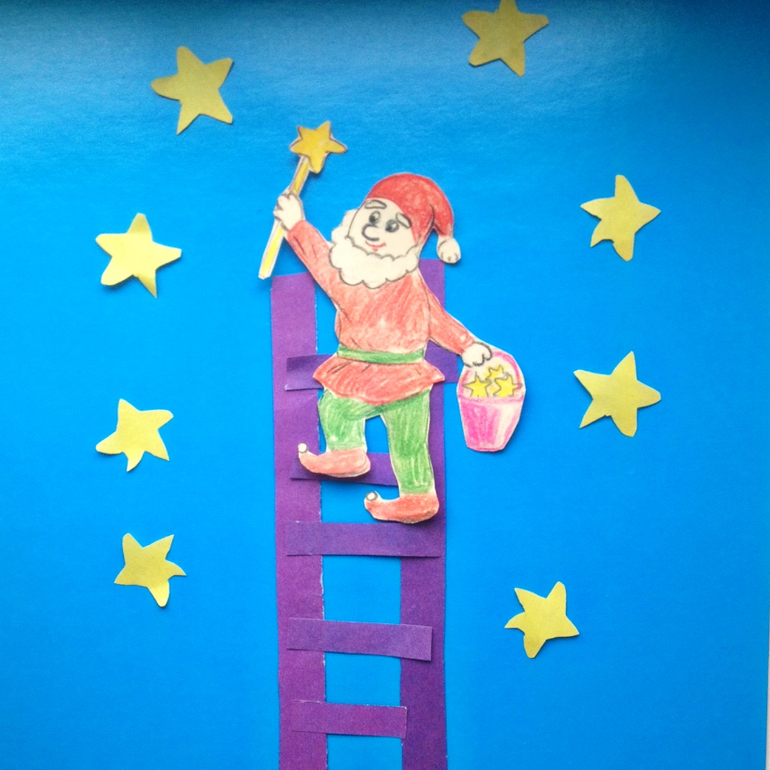 Наши гном любит по ночам зажигать звезды. Мы ему помогаем, делаем лесенку и все остальное. Аппликация.