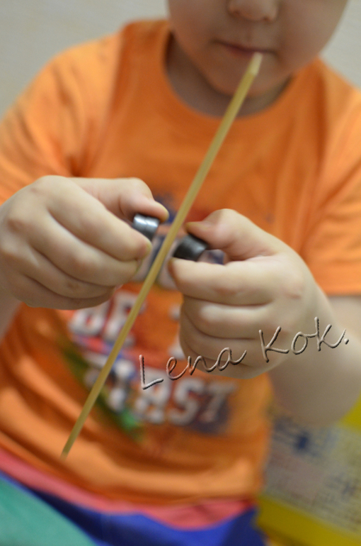 есть ли что-то, что может повлиять на силу тяжести?) Это мы сегодня и выяснили) Сперва задала вопросы: "почему когда мы подпрыгиваем, то не улетаем в космос, а обратно приземляемся на землю? Почему, если бросить предмет вверх, он упадет на землю?"...тут Макс ответил без промедления - сила земного притяжения))) это мы уже проходили) А есть ли что-то, что может повлиять на силу зем.притяжения, что будет сильнее?) Вот тут у сына ответа не было))) И наглядно мы изучили "магнитное притяжение". Нам понадобились скрепки, нитки, скотч, магниты, линейка и конструктор лего(подойдет стопка книг, да хоть стаканы). Для начала просто изучили скрепки на нитках, подбрасывали их вверх, и смотрели как действует на них земное притяжение, а вот потом, посмотрели как действует на них магнитное притяжение) Попыталась объяснить сыну почему так происходит, но поняла что нам про атомы ой как рано пока))) И мы просто изучали магниты, сын очень удивился, что они могут притягиваться даже через линейку)))