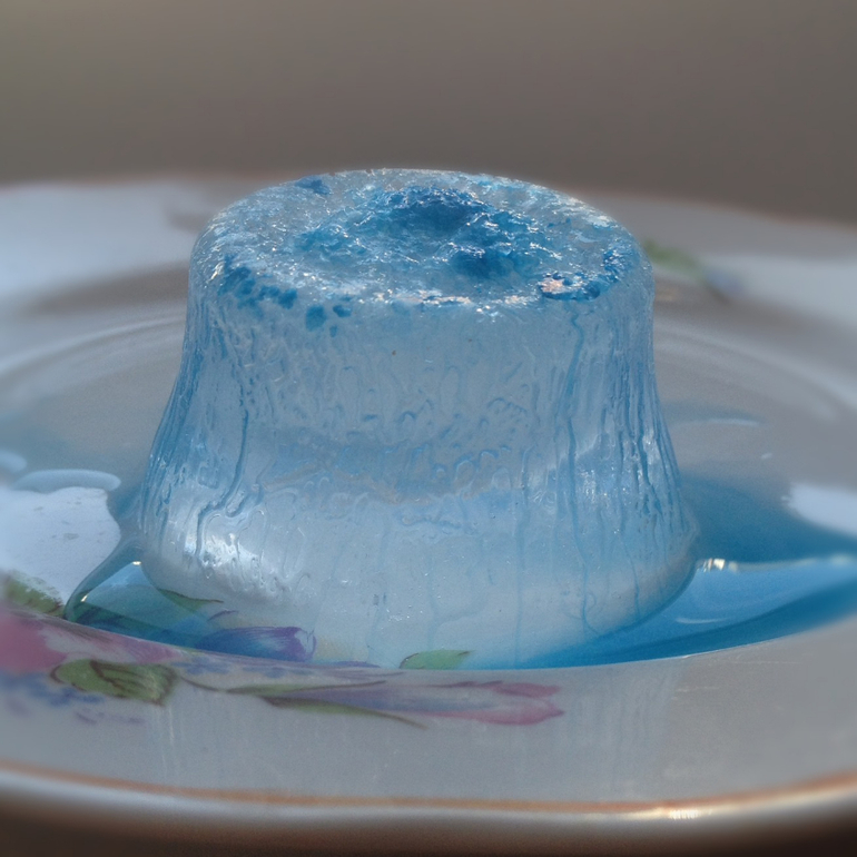 Для начала можно просто посмотреть как льдинка тает. Это происходит медленно. А чтоб ускорить, нужно посыпать лед солью. Он сразу становится такой рыхлый. Если сверху капнуть краски, то она красиво окрасит льдинку.