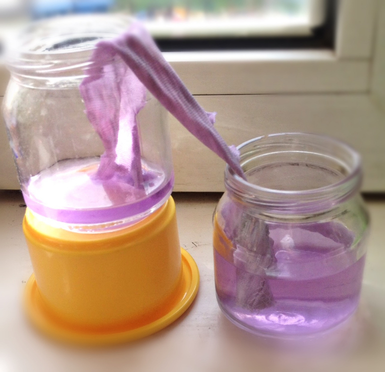7. Вода сама перетекает в другую баночку.Опыт долгий. Результат будет виден только на следующее утро. Воду лучше брать подкрашенную. Одну банку надо поставить повыше, другую ниже. Из одной банки вода по тряпке переберется в другую.