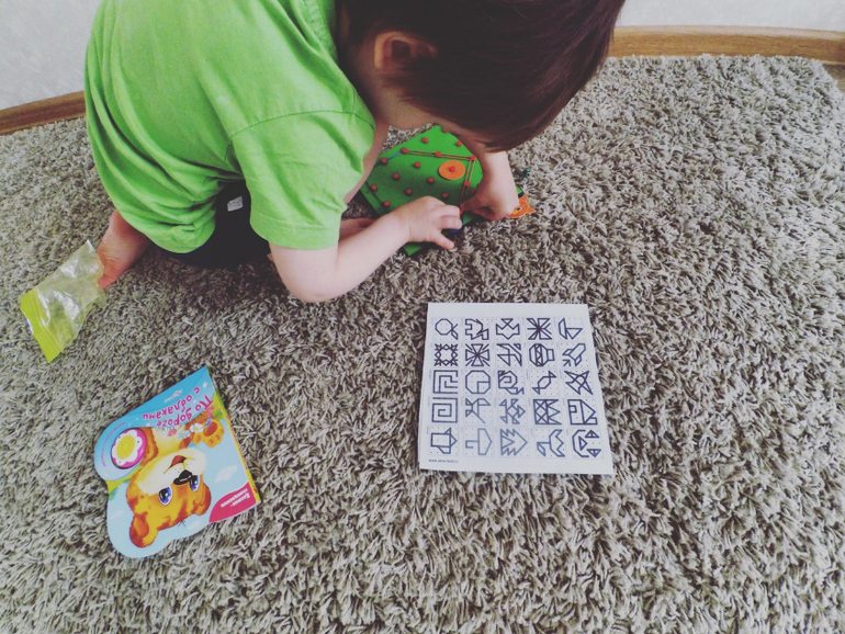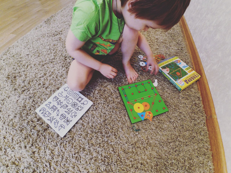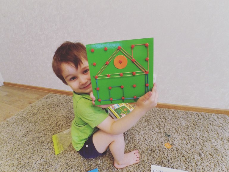 Новый хит сезона _ геоборд) интересная штука,маленького курощателя домомучительниц занимает надолго, к тому же очень пользительна для развития мелкой моторики ,пространственного воображения ,ну и мозгов в целом.В коробочке с игрой идет сам ,собственно,геоборд,схемы с картинками,буквами,инструкцией для родителя ,цветные резиночки и несколько картинок с дыркой по середине для самостоятельно выдуманных игр. Рекомендованный возраст 3+,Тимону прокатила б и раньше,жаль я о такой замечательной штуке узнала только недавно