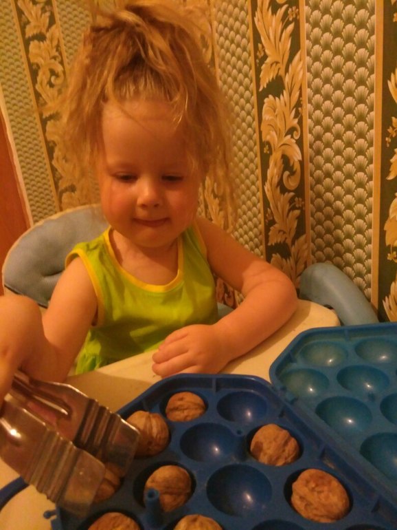3 Перекладываем грецкие орехи из чашки в контейнер из под яиц. Уж не думала, что у ребенка вызовет такой интерес это занятие. Перекладывает ложкой, щипцами кулинарными (перепробовала все, что есть на кухне).