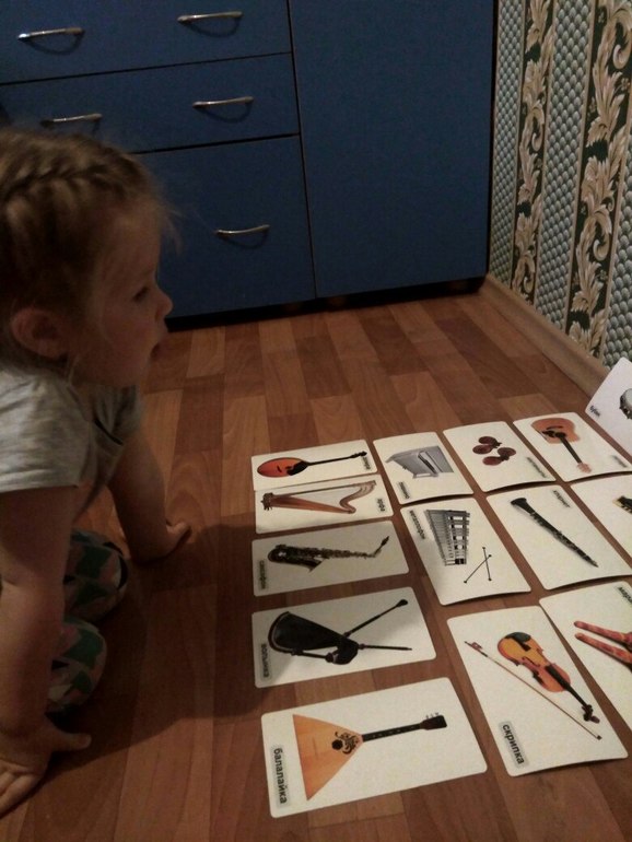 1. Недавно попробовали поиграть в звуковое лото. Делала подборку карточек (у нас ) с животными, насекомыми… в интернете нашла записи с голосами животных. Слушали-угадывали-искали нужную карточку. Ещё попробовали поиграть так с музыкальными инструментами. Конечно, сложнее, но кое-что угадали (скрипку, гитару, барабан, арфу). Остальное слушали и соотносили с картинкой… дочке очень нравится!