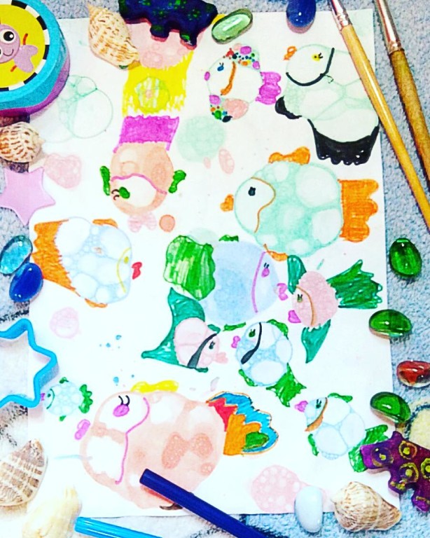 После того, как мыльные разводы у нас получились, дальше дело за детской фантазией. Моим девочкам захотелось нарисовать рыбок. Получилось мило :-)