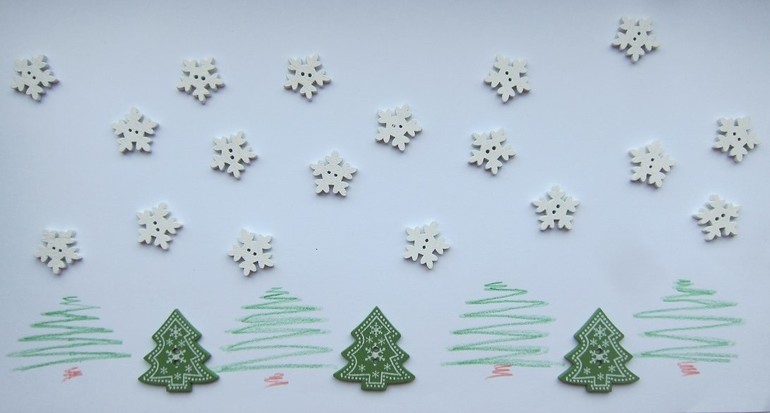 Снежинок брала набор 50 штук. Елочек штук пять, наверное. Высота елочки 3 см. Диаметр снежинки около 1,5-1,7 см.