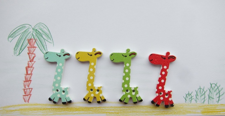 Их точно было пять! Один жираф сделал ноги. Дима удивляется, что они постоянно спят. С жирафами только в укладывание играет)) Жирафики толще всех остальных пуговок: они 4 мм, а остальные - 2 мм. Высота фигурки - 4 см.