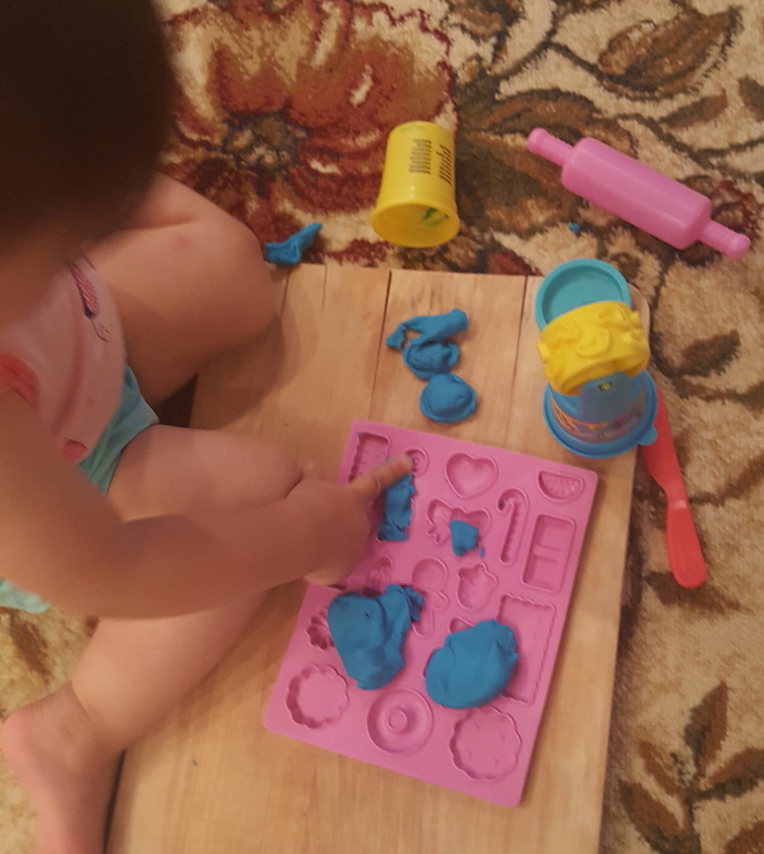 Творчество. Это наш самый любимый процесс. Всерьез и надолго полюбили пластилин во всех его проявлениях: массу для лепки, тесто для лепки, советский "деревянный" пластилин используем беспощадно на даче. Периодически занимаемся где-то по полчаса.