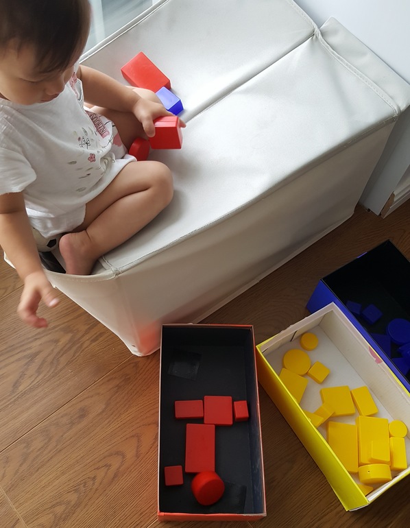 Основная наша игра на цветовую тему - это классификация предметов по цвету. Здесь, к примеру, классифицируем блоки Дьенеша по разноцветным коробкам, обклеенным самоклеящейся бумагой: