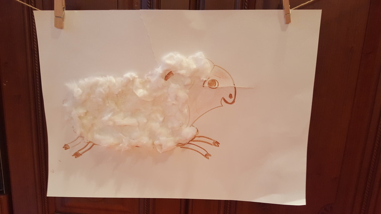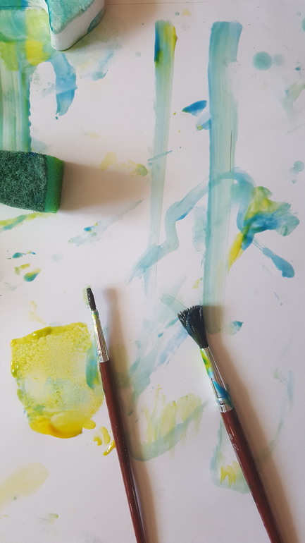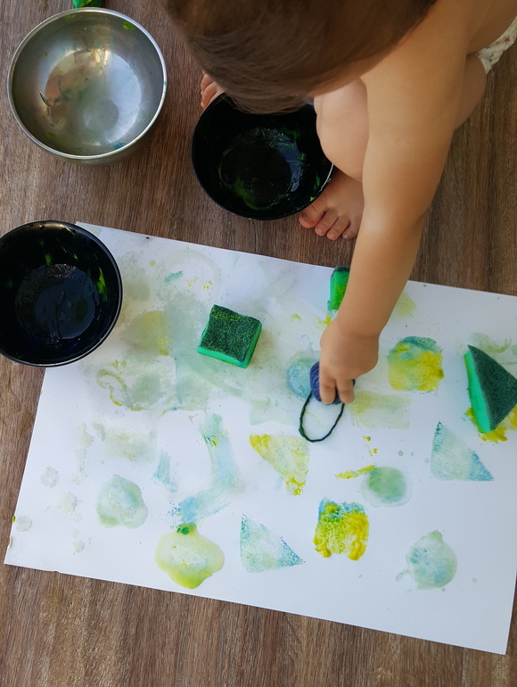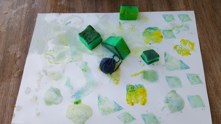Рисовали фигурки на бумаге зеленой и желтой красками с помощью вырезанных губок и клубка шерсти (клубком делали круги):