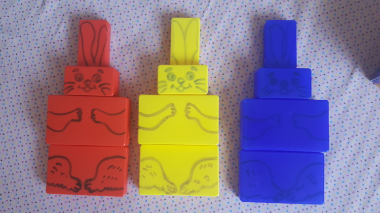 Рисуем зайчиков на блоках Дьенеша и предлагаем подобрать к ним ушки по цвету: