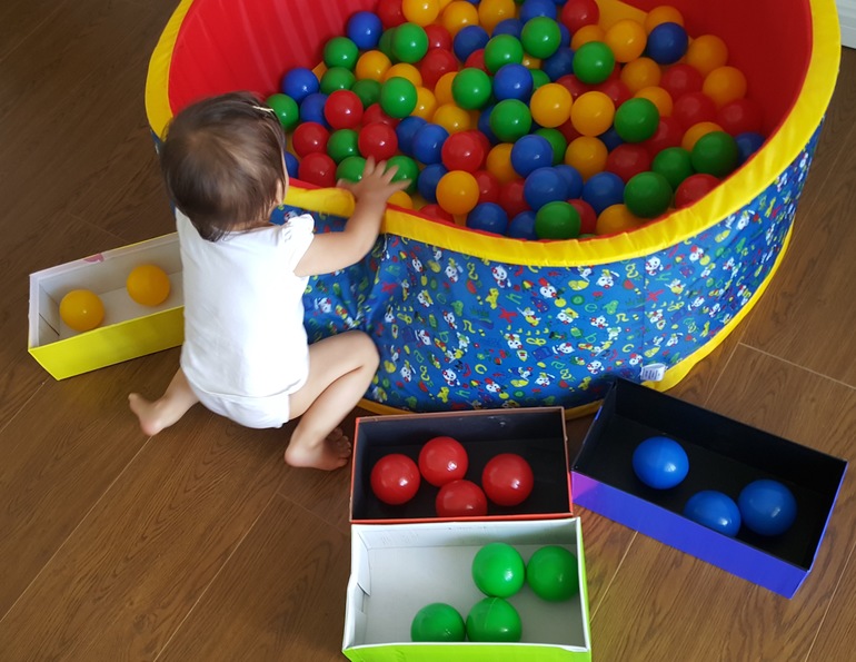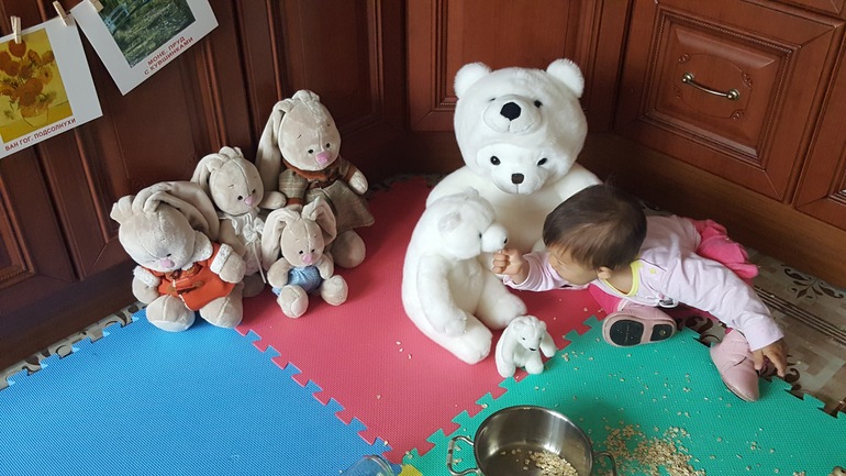 Уже неплохо ориентируется в основных четырех цветах. Недавно обнаружила, что она различает оранжевый цвет, возможно, и еще какие-то, но мы этого еще не заметили.