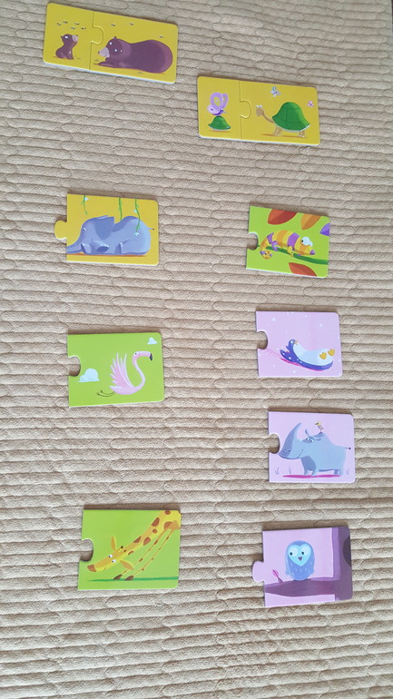 Недавно предложила пазл Мамы и малыши Джеко, справляется пока плохо, только пытается осилить пазловый замок, но на лицо старания. А малышей к мамам подбирает хорошо: