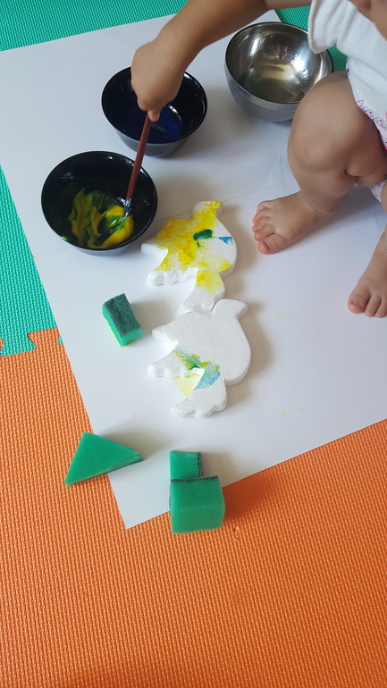 Кроме пластилина в ход шли краски. Здесь раскрашивали голубей, опять смешивая зеленый с желтым, обращая внимание на изменение цвета: