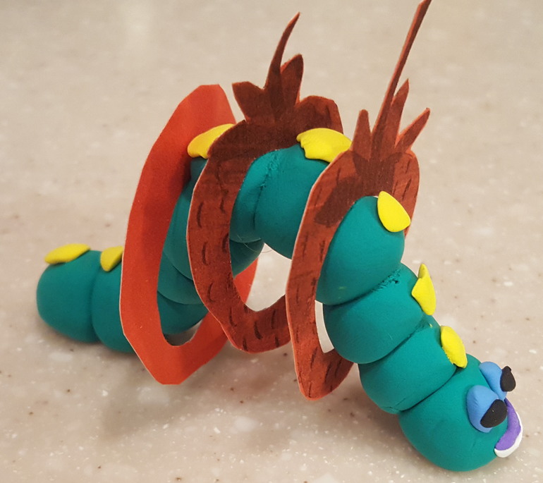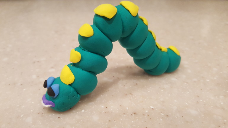 Обыгрывали "Очень голодную гусеницу" Эрика Карла. Слепили гусеницу из массы для лепки (она очень хорошо застывает и получается довольно прочная игрушка). Дочка принимала активное участие, рвала кусочки и даже пыталась скатывать в руках: