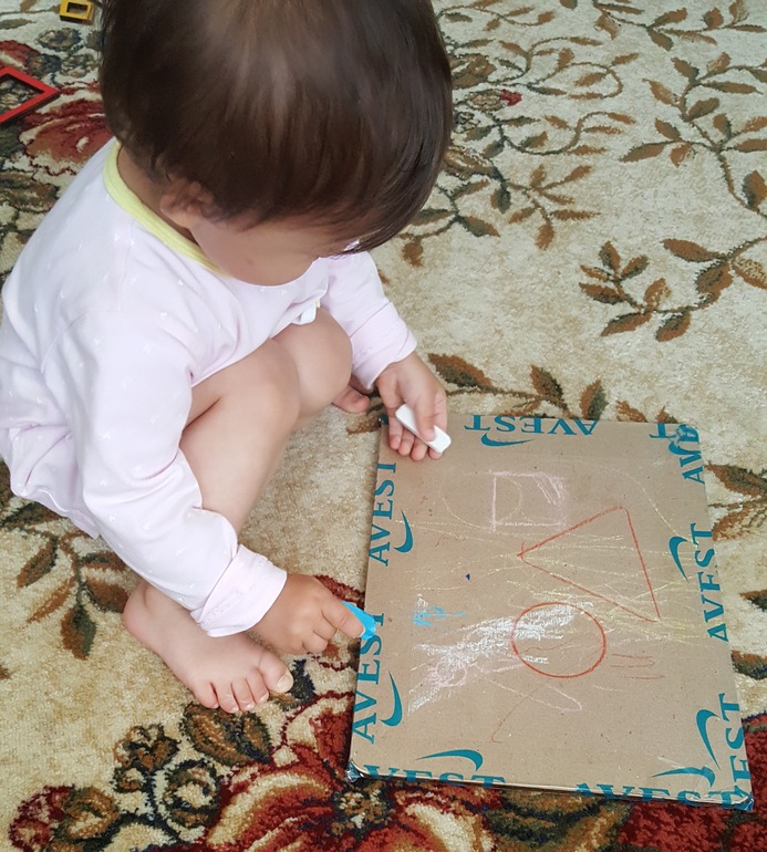 Обводили Паутинки Монтессори (конечно, с моей помощью) и пытались закрашивать мелками. Обводили с обратной стороны этой же доски. Не знаю, есть ли это замечательное пособие лучшего качества, но наша фанерка быстро развалилась.