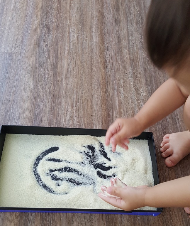 Рисовали руками по манке, насыпанной на крышке от коробки с черной поверхностью: