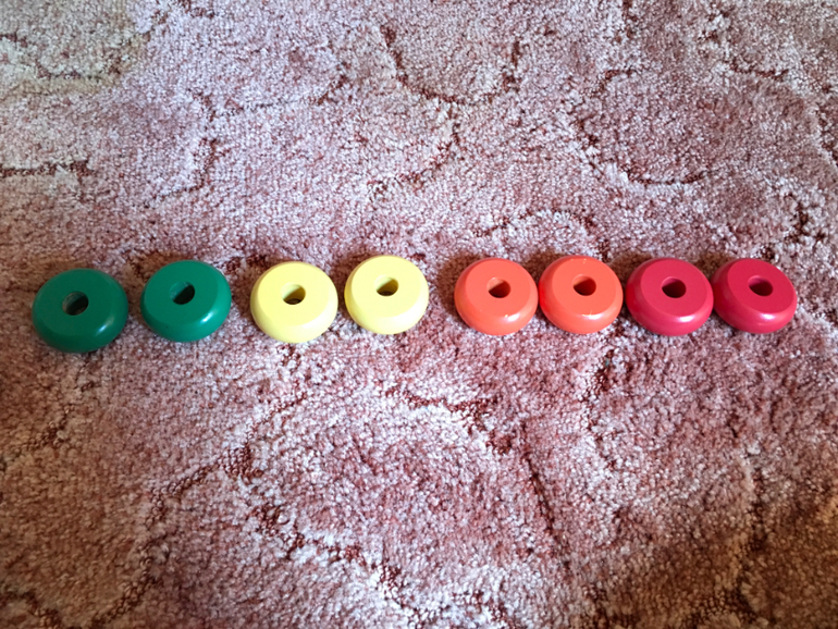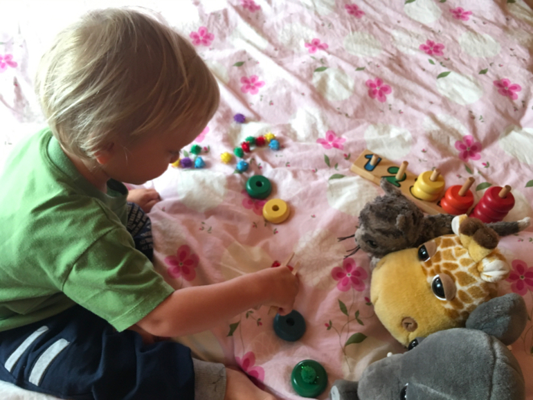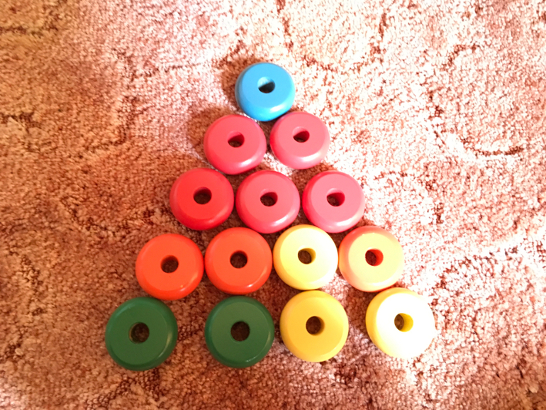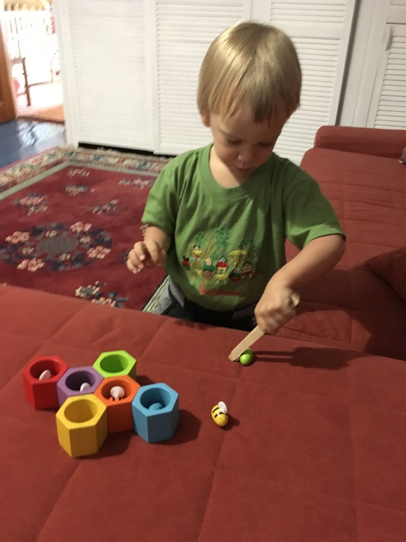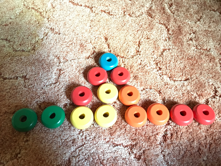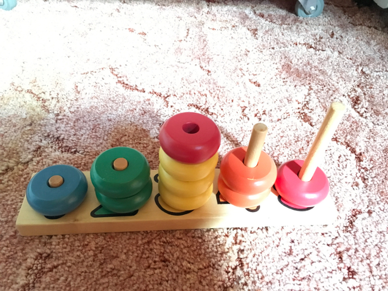 Стало резко заметно, что вырос из отдельных пособий. Любимая дощечка с замочками не произвела должного эффекта, несмотря на длительный перерыв, зато старенькая Икеевская пирамидка стала хитом. Обыграли пару десятков игр и комбинаций с ней на счёт, логику, память и внимание. Муссировали как и раньше - больше, меньше, столько же, ввела понятие состав числа, на сегодня усвоили 2 и 3, выкладывали последовательности, изображения - транспорта в первую очередь, учились играть в "обезьянку" - просила повторить за мной элементарные комбинации. Вообщем, игр с этой примитивной на первый взгляд штучкой - вагон и маленькая тележка.