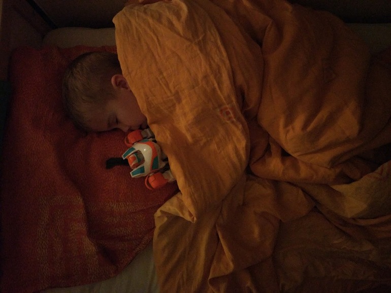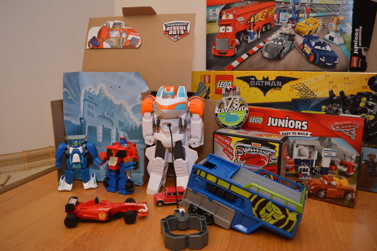 Больше всего ожидаемо впечатлили Лего с Молнией Маккуин и Боты-спасатели (хотя я ставила на Оптимуса, а уснул Влад в обнимку с вертолетом). Для Ботов мы даже смастерили базу (она слева на заглавном фото) - из картона и упаковки, на которой был принт фоном в виде их базы из мультика.
