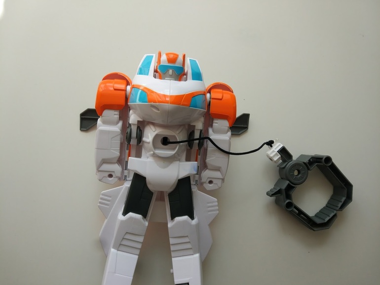 Владу больше понравился вертолет-робот, таскает его везде теперь, даже спит с ним. Этот робот самый большой из всех Владиных трансформеров (что уже половина успеха), к тому же у него прикольная клешня - если крутить винт она опускается и поднимается, и довольно цепко хватает другие игрушки. Так и уснул потом с вертолетом :)