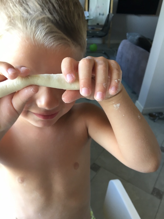Периодически придумывает игры себе из подручных материалом: возьмёт кисточку, половник и ходит " зачерпывает краску" из половника кисточкой что-то красит. Залезет к сестре в шкаф и устроит там зоопарк..