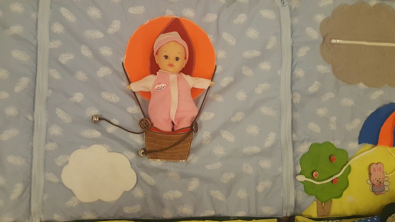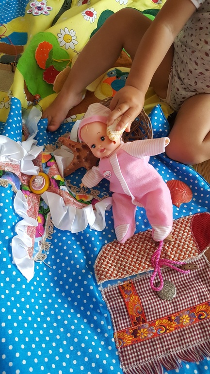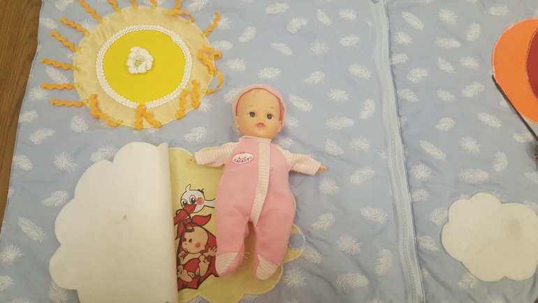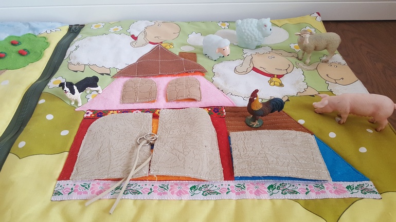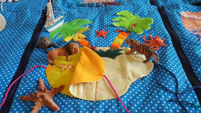 Разыгрывали сюжеты по развивающему коврику из ткани и фетра. Он у нас очень большой - 2 на 2 метра:
