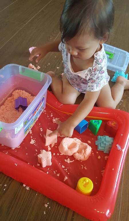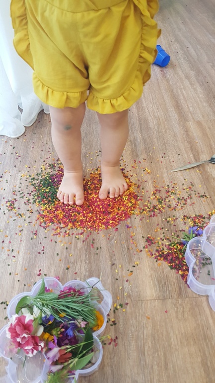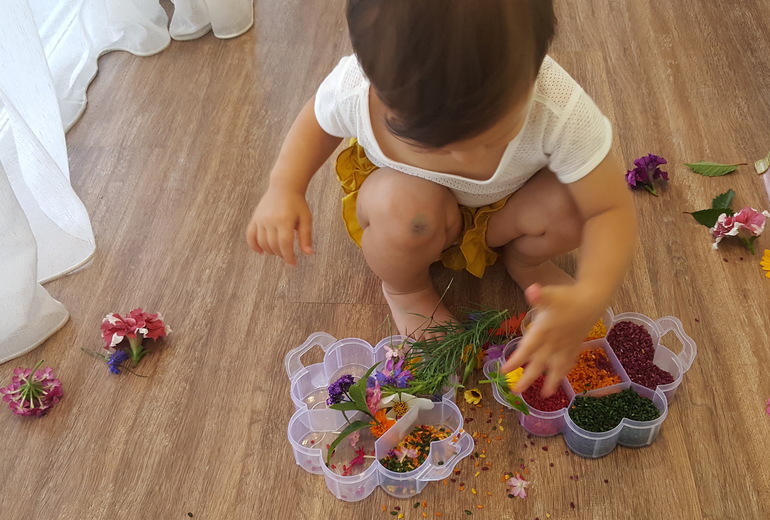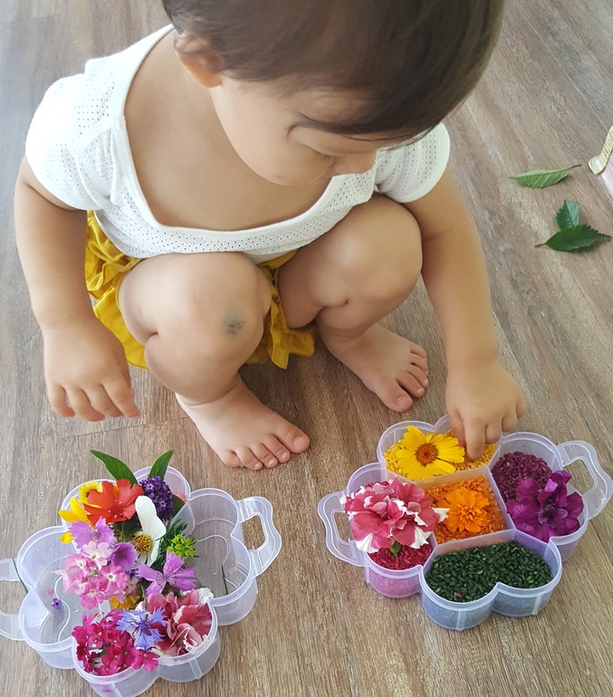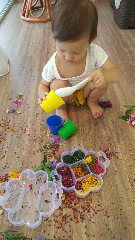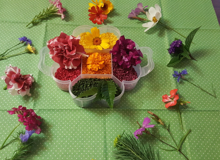 И сделали сенсорную коробку из цветного риса и цветов, подобранных к цвету риса: