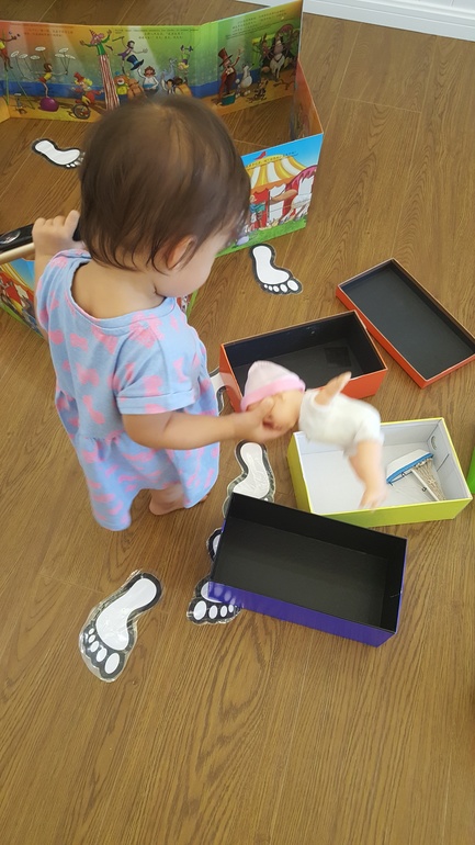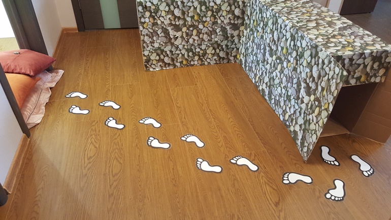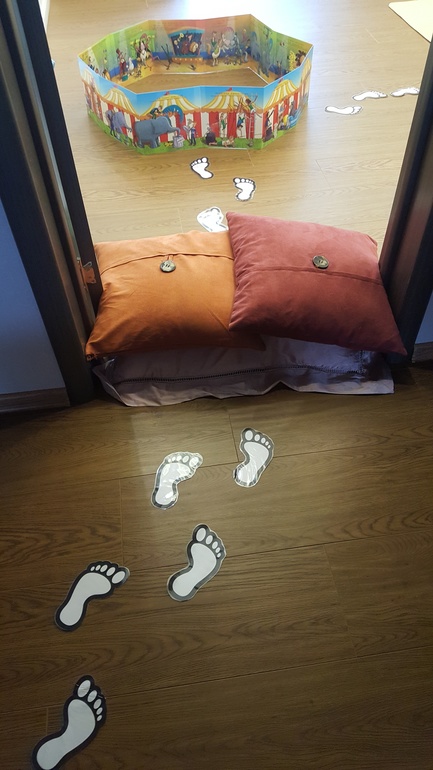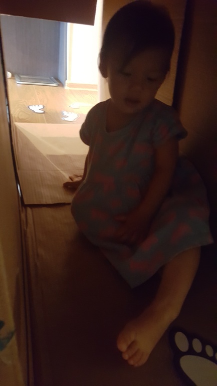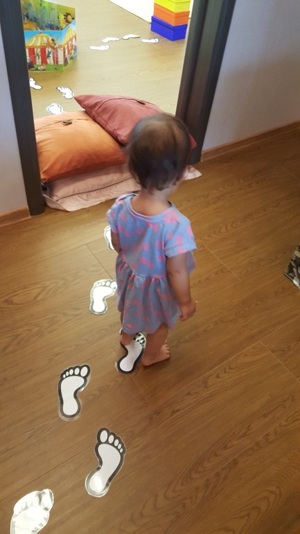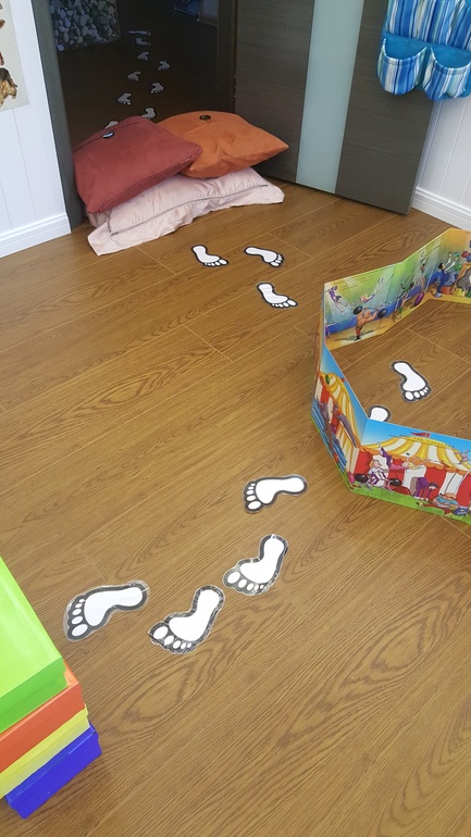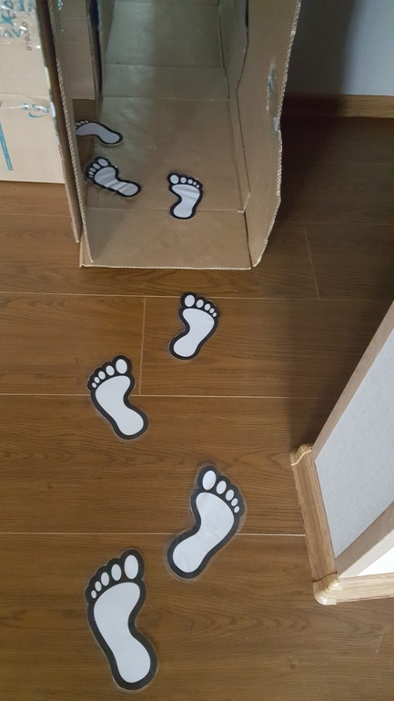 Провели подвижную игру, ориентированную на формирование навыков ориентирования в пространстве. Использовали лабиринт из коробок (показывала в прошлом месяце) и заламинированные следы из бумаги. Задание - найти того, кто оставил следы:
