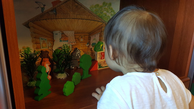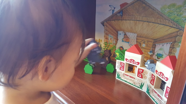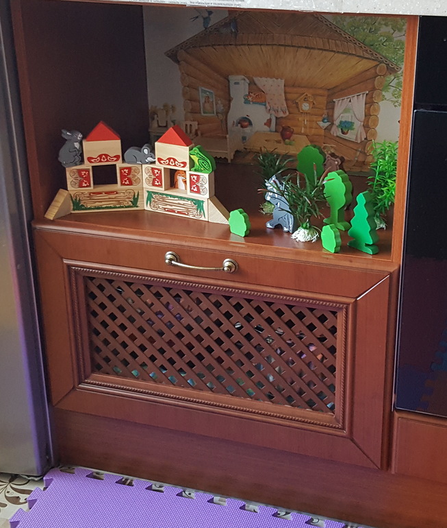 Обыгрывали сказки. Для этих целей ребенку была выделена отдельная полочка на кухне (заднюю стенку с розетками заклеили фоном из сказки "Курочка Ряба"):
