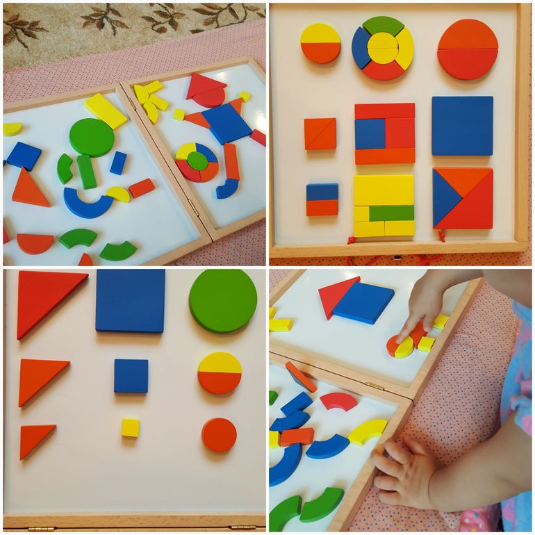 Много времени проводили с магнитным конструктором Джеко. С помощью него изучали понятия больше-меньше, части и целого, а также сами формы и цвета: