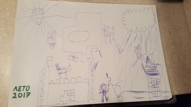 А вот этот рисунок неизвестного художника нам подарил торговец фруктами на трассе. Ребёнку рисунок очень понравился и развлекал её долгое время. Я оставила его на память об этом лете и решила сохранить ребёнку на будущее вместе с другими знаменательными мелочами, которые буду постепенно складывать вместе.