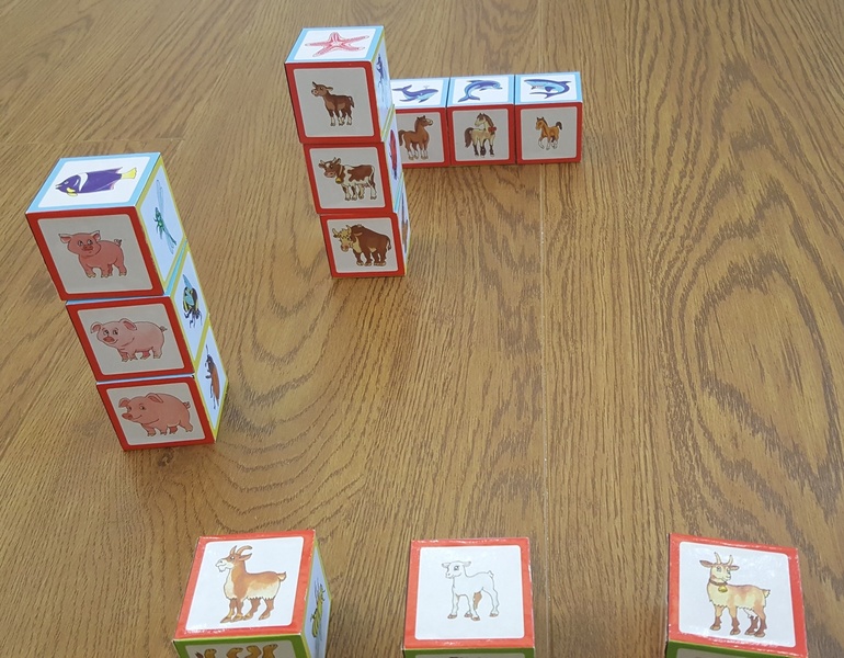 С помощью кубиков от Айрис-Пресс собирали семьи животных и повторяли понятия слева-справа, ближе-дальше, впереди-сзади.