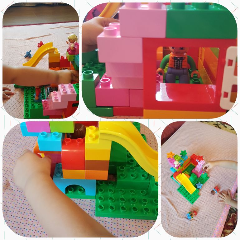 Пространственные отношения изучали и на примере конструктора Лего. Размещали человечков внутри, снаружи, сверху, сзади: