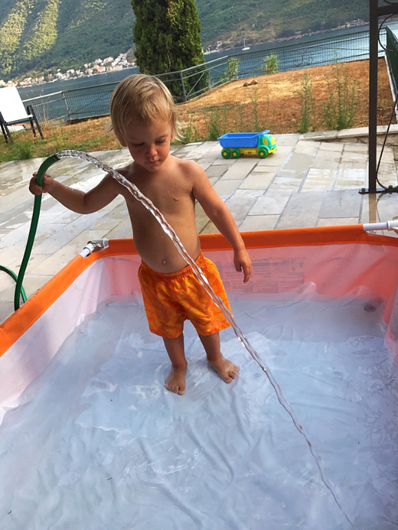 В итоге смело ныряет, задерживая дыхание, опускает мордашку в воду, прыгает, ну и дурной пример, естественно, заразителен - старшие активно помогают и демонстрируют свои умелки. А не повторять в большой семье никак нельзя - окажешься в дураках отстающих, а это не про нас. На лицо мощный, но легко управляемый темперамент. Как и должно быть у настоящего мужчины, ИМХО.