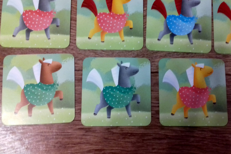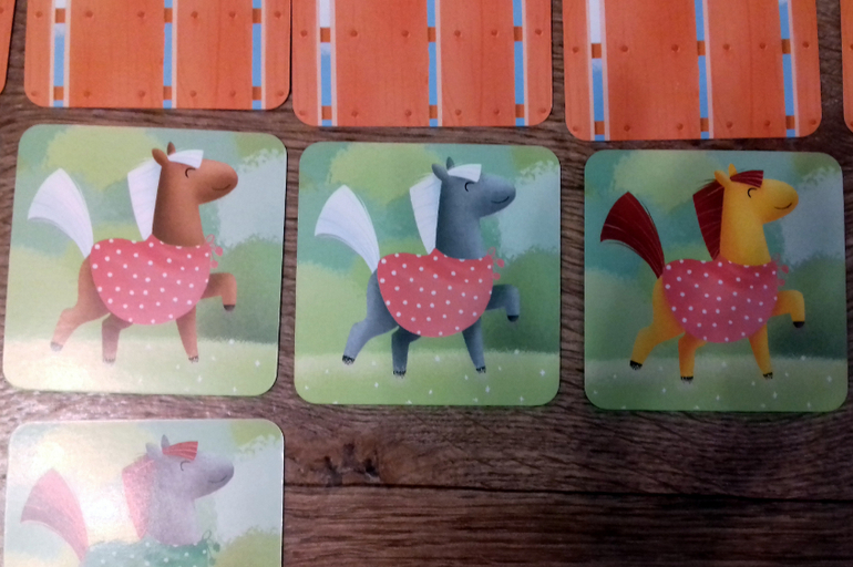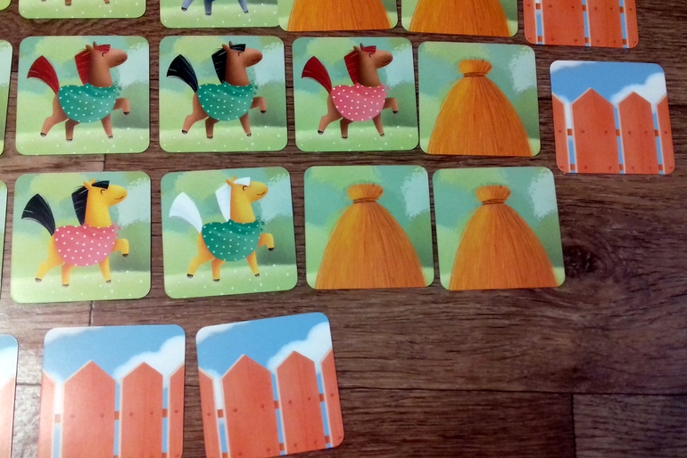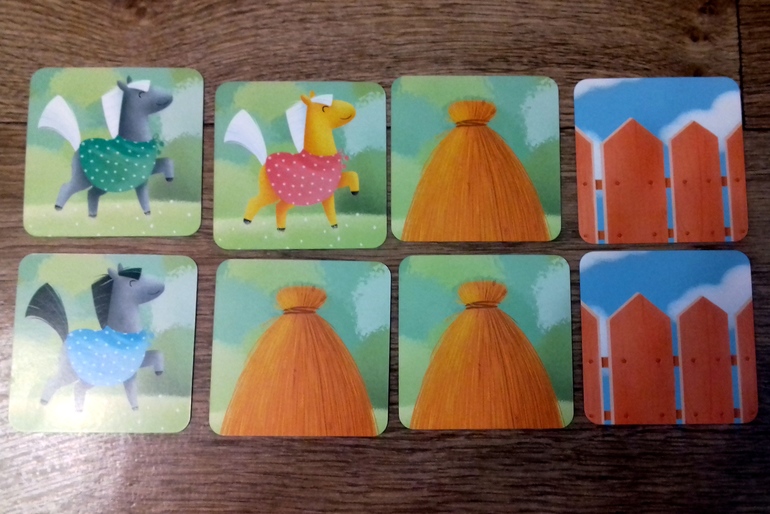 Игра для 2-6 игроков возраст от 4 лет. Состоит 27 карт разноцветных пони, 34 карты забора, 9 карт сена, 5 карт подковы.