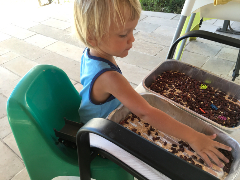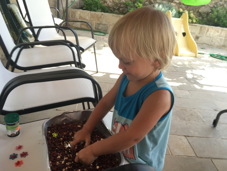 Очень соскучился по крупам. С жадностью набросился на фасоль. Как хорошо, что все новое - хорошо забытое старое. Выбирали цветочки и жуков, параллельно повторяли счёт, заодно выясняли, кого больше-меньше и кто обделён цветком.
