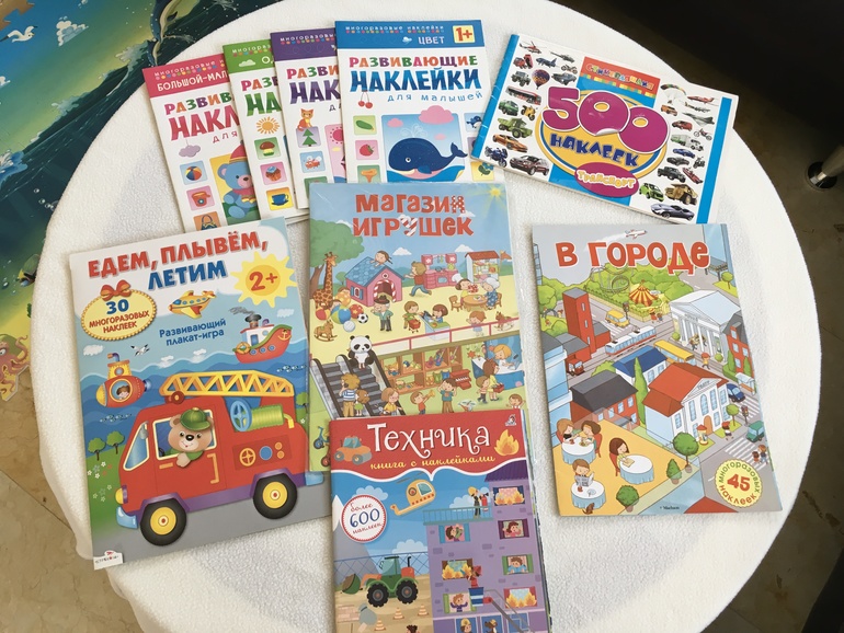 И наклейки. Вот тут позволю себе высказаться. Наклейки - наклейкам рознь. Самые неудачные от Роббинса - бумажные, рвутся даже у меня под пальцами... у Махаона не нравится дизайн, не могу понять, что с ними не так, но такое ощущение, что художник нарушил законы перспективы. От Стрекозы - отличные плёночные, мы использовали основное поле как площадь для города. Качество - супер. Развивающие наклейки сверху - похоже мы их переросли... 500 наклеек отличные, можно использовать в Мильоне игр.