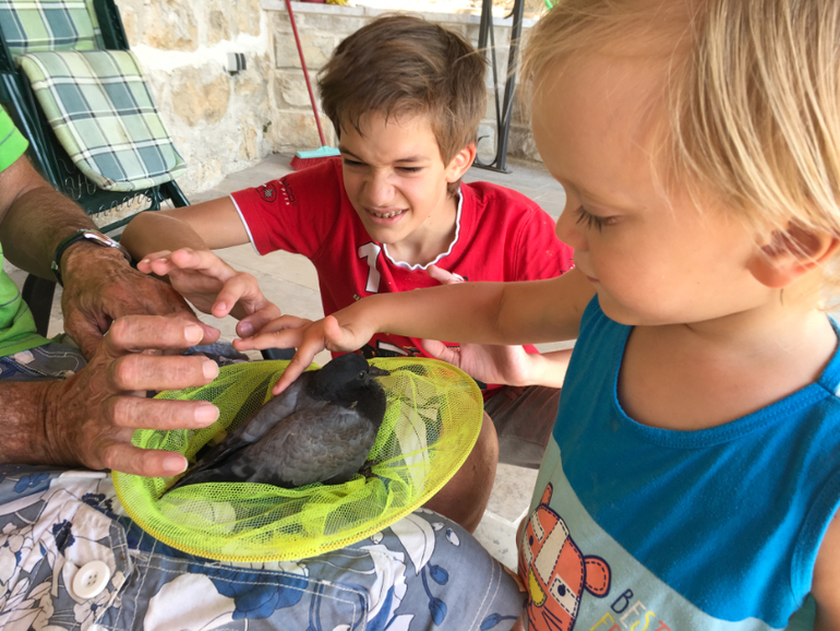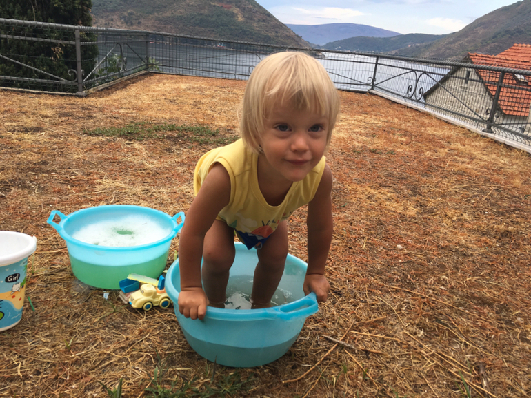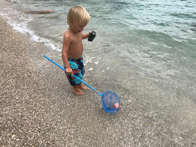 А это задание вызвало неожиданные трудности. Вылавливали из моря резиновые игрушки сачком. Получалось только накрыть, а вот перевернуть сачок с игрушкой внутри догадаться не смог. Все-таки соображалка у нас тормозит.