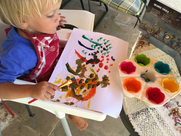 Рисовали салют на волне популярности книги о Джордже. Очень быстро сообразил, что состоит из хвоста - прямой линии и мазочков. Все-таки занятия творчеством с ребёнком в более менее сознательном возрасте гораздо приятнее и продуктивнее.
