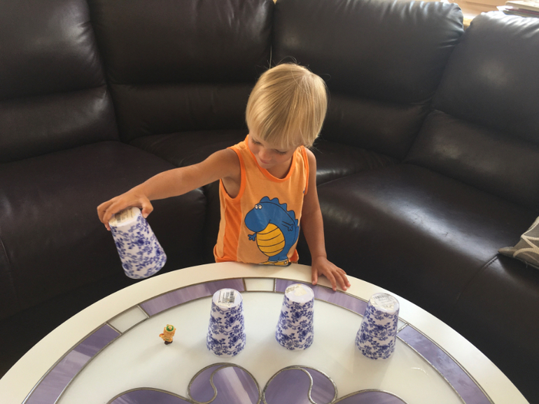 Тренировали память в игре Наперсточки. Четыре стакана и игрушки вызывают трудность, если только неоднократно меняю местами. Можно переходить к 5-6 стаканам.