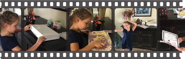 Анютка открыла коробку и нашла листы с заданиями, ладошки и вкусняшки.