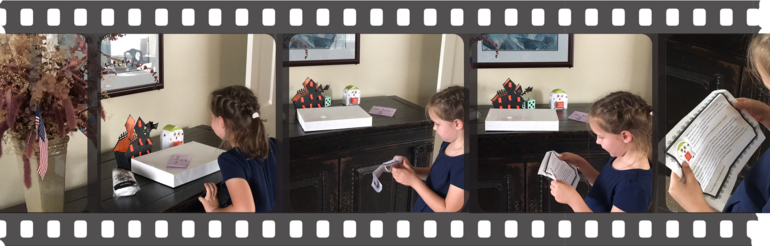Анюта открыла одно из окошечек и увидела в нём ребёнка, переодетого в костюм Волчонка. Далее, мы нашли задание от этого персонажа: Нарисовать картинку, соединив точки по цифрам. Получился замок. По условиям Няшки, после выполненного задания, нужно найти соответствующую Вкусняшку, которую мог предложить персонаж из окна. Нашла и накормила Няшку.