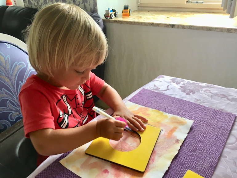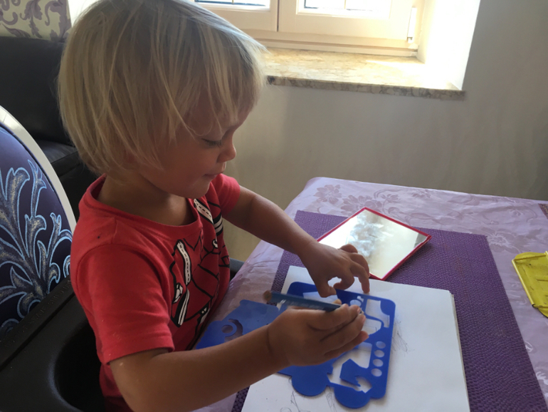 Обновили трафарет с транспортом - непростая это работа и обводили рамки Монтессори ( тематика, естественно, транспортная). Первые два фото - без тренажера, захват неправильный, на третьей фото идеальный захват с тренажёром , на последней пальцы съехали - надо все время следить и поправлять.