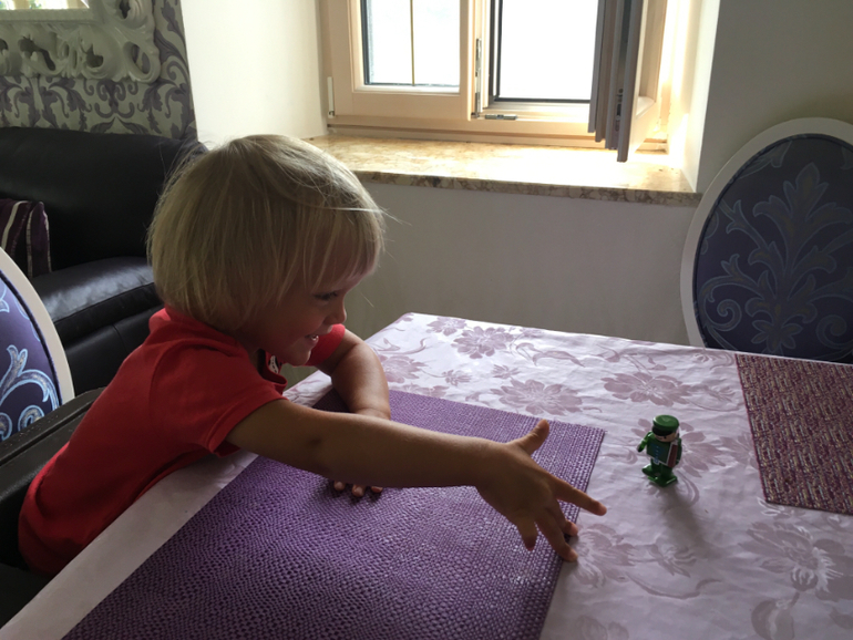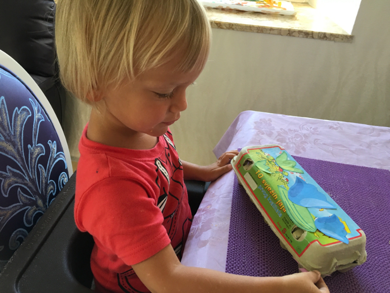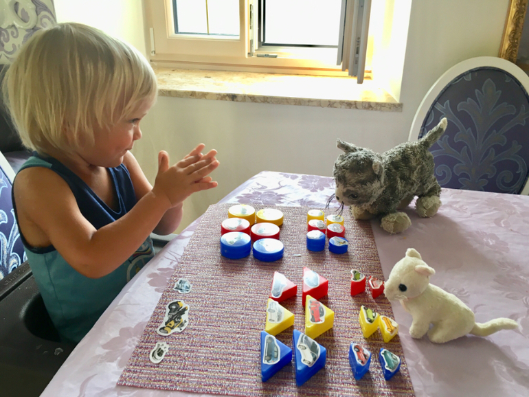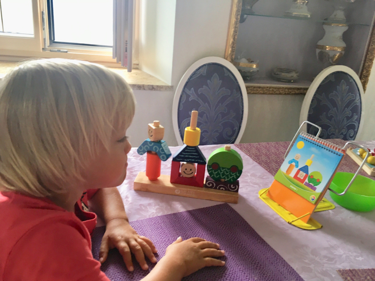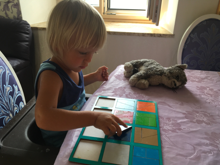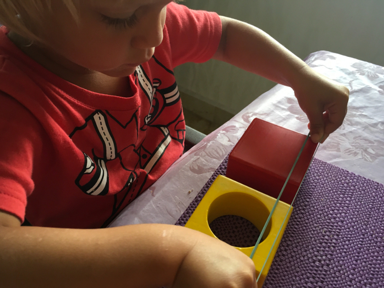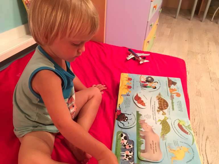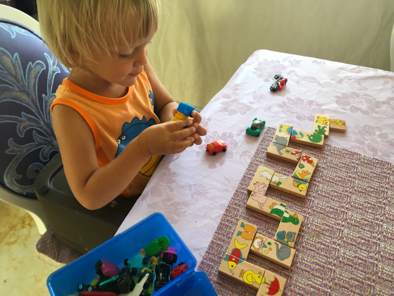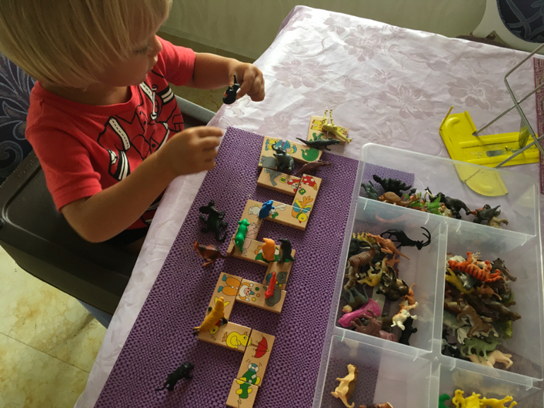Изрядно попотели над этим домино. Не предполагала, что будет настолько трудно правильно поставить нужную деталь. Крутит по- всякому, а правильное положение не замечает. Восприятие целостности предмета ещё не сформировано, надо работать.