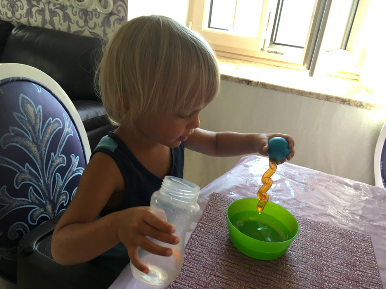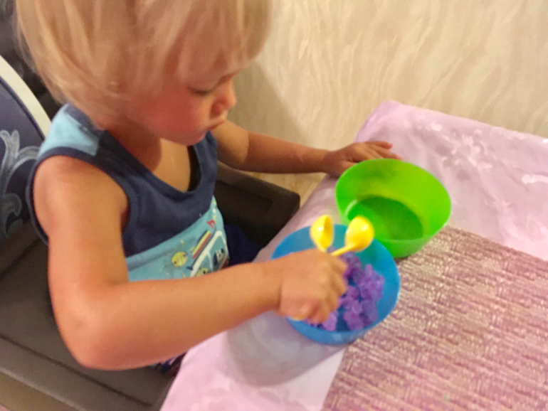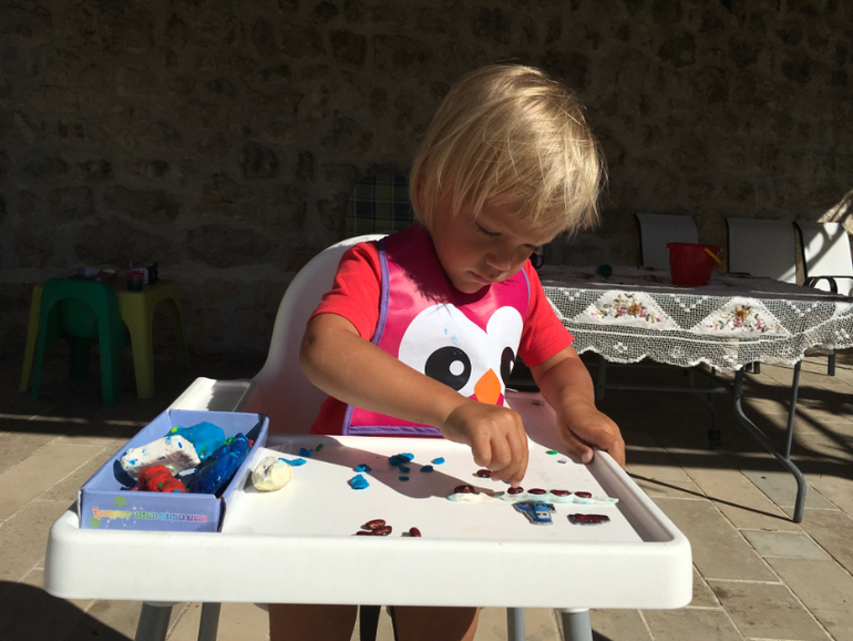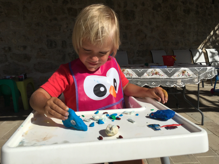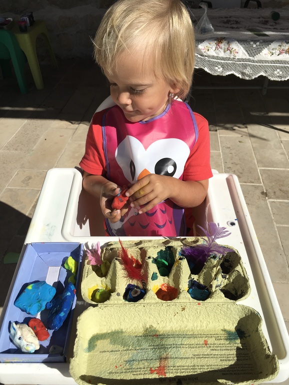 Проснулся интерес к лепке, получается даже что- то наподобие шариков и колбасок, но любимое занятие - щипать пластилин на мелкие кусочки.