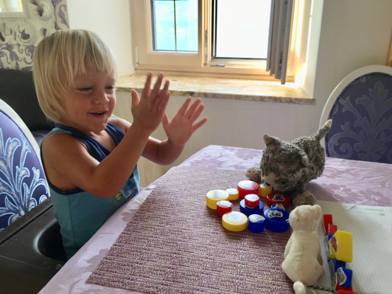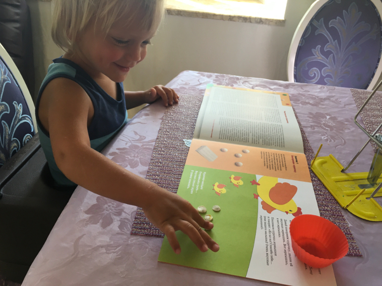 Лучше всего дела обстоят со всем, что связано со счетом и количеством. Научился изображать количество на пальцах в пределах пяти, ну и четко осознал, что всего пальцев на руках - десять. Закрепляли счёт с помощью книжки с наклейками.
