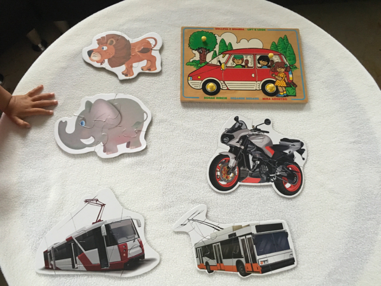 Вот такие пазлы 5-7 кусочков собирает теперь легко без моего участия. За неимением других застопорились на них.