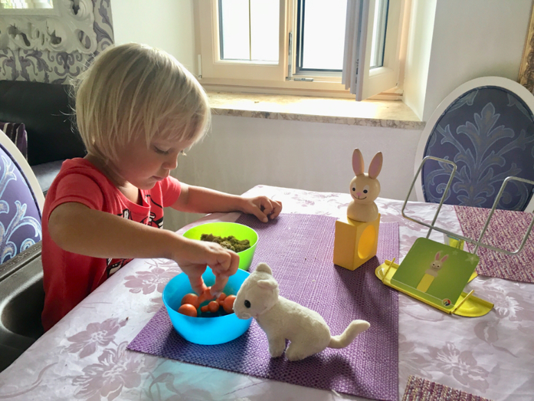 По карточкам пока общими усилиями с моим активным участием. И , естественно, триллер с участием брата ( слева) и сестры ( в домике). Кролик в этом плане более приемлемый вариант, начинать, разумеется, надо с него.