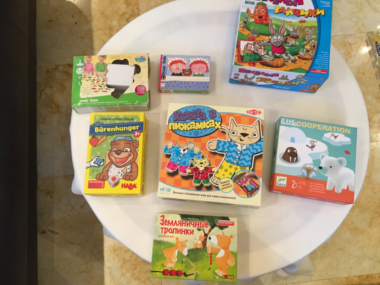 На них практически не остаётся сил и времени, поэтому перенесла домашнюю игротеку на выходные. Это те игры, которые успели попробовать в этом месяце. что сказать? Концепцию с кубиком понимает, хотя, конечно, на данный момент интереснее всего запульнуть его куда-нибудь в труднодоступное место. Совершенно не понял Кооперацию, все время норовил вернуть зверей обратно и выстроить их на мостике. В Конфетках нас хватает на 3-4 штуки, дальше начинается баловство, ну и Голодный мишка, наверное, самый оптимальный вариант для этого возраста, чтобы играть по правилам. В зайцах самая интересная часть - механическая, кропотливо и долго изучал механику; в Додо сократила количество карточек; котята милы, но нет уверенности, что понял принцип; земляничные тропинки вообще пока не про нас. Вывод - рано. Не доросли мы до настолок. А вот после 3-х, я уверена, они выстрелят. Коплю материал на подробный обзор по нашим играм.